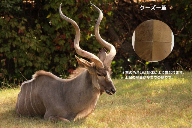 クーズーはシカのような角(角長100〜180cm)を持った体長190〜250cm、体重190〜315kgとかなり大きな「ウシ科」の動物で、仲間同志の戦いや草木に擦れて、キズがたくさん刻まれています。角のキズが深く長い事もあり、天然の革全てを使えるわけではありません。その為ショルダーバックに適した革の部分だけを贅沢に使う事で、文字通り「自分だけの一点物」になります。