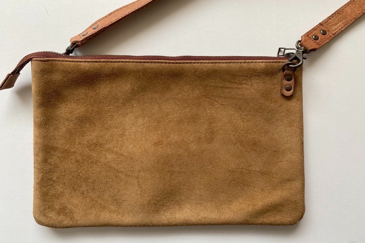 鞄の表面生地は選択可能です。スエードはクーズー革の裏面をベルベット状に起毛させた革で、丁寧な仕事を施しているので上品さと柔らかな手触りを持ち合わせています。いつまでも触っていたくなるような、クーズー独自のこの特徴は、どんな牛革や鹿革でもその味わいを出せないのです。