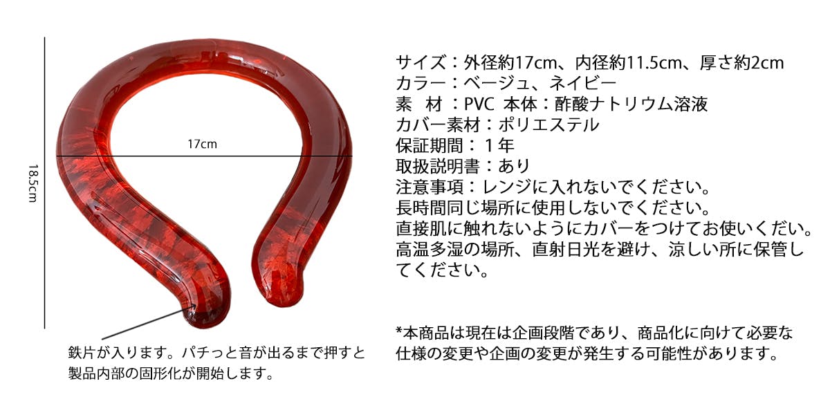 本体の中にある鉄片を3〜4回「パチっ」と音が鳴るほど押し曲げます。製品中にある酢酸ナトリウム溶液が白く結晶化しながら発熱します。(約50度まで上昇)熱が徐々に下がりながら適当な温かさを保ち、約40~60分間持続します。