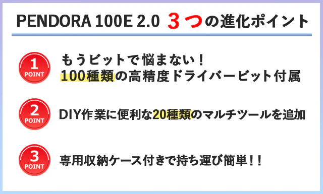 PENDORA 48EとPENDORA 48E 2.0は、皆様の温かいご支援により、改良を繰り返し、より良い製品を目指して進化を続けてきました。今回の100Eでは、ビット数を48→100に増強するだけでなく、より軽く、より持ち運びに便利な製品に改良しています!!!
