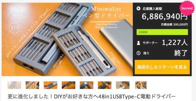 みなさん、こんにちは。BRIGHT DIYです。本日は皆さまに新しいプロジェクトを紹介させて頂きます。最大43%OFF!!!さらに、公開から5日間限定で使える15%OFFクーポンを発行させて頂きました。━━━━━━━━━━━━━━━━━━クーポンのURLはこちら↓https://camp-fire.jp/projects/814601/view?ctoken=FbK1juFQvCgkUzYiクーポンは3月30日~4月3日限定でご使用頂けます。━━━━━━━━━━━━━━━━━━DIY好きのみなさん、金属まで穴あけができる精密ドリルはお持ちですか?木材から金属まで自由自在に加工ができて、穴あけ精度も高いコードレスミニルーター「BOLTZ」です!プロジェクト概要キャンペーン期間 2025年3月30日~2025年5月10日プラットフォーム CAMPFIREキャンペーンURL https://camp-fire.jp/projects/view/814601※プロジェクト公開後から閲覧可能になります。2025年3月30日の8時からプロジェクト公開となります。数に限りがございますので、早い者勝ちです!!!BOLTZ DIY TOOL KIT 1点のご支援の場合は先着80名様に限り20%OFFの早期リターンを適用させて頂きます!※早期リターンは在庫がなくなり次第終了となります。BOLTZ DIY TOOL KIT (基本セット):BOLTZ DIY TOOL ADVANCED KIT (アドバンスセット): もっと見る