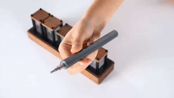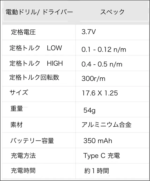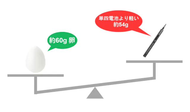 電動ドライバー本体の重さは約卵1個分。直径16mmのスリムなデザインなので、ペンのように簡単に握れる仕様です