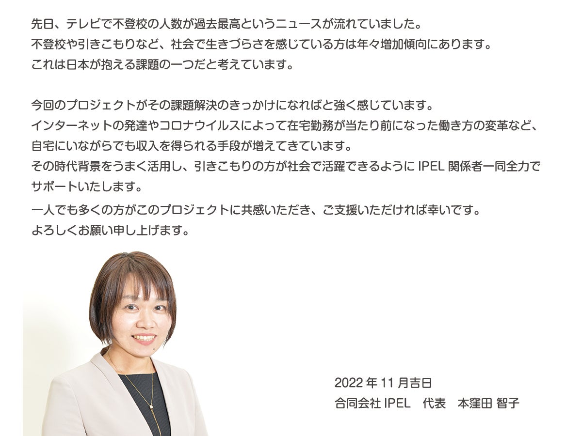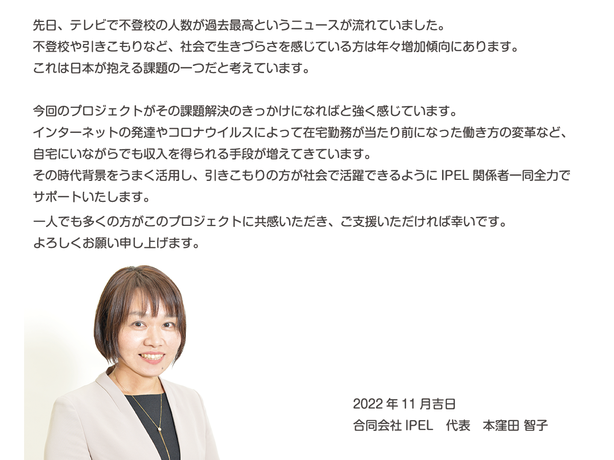 はじめまして、合同会社IPEL(アイペル)代表 本窪田 智子です。