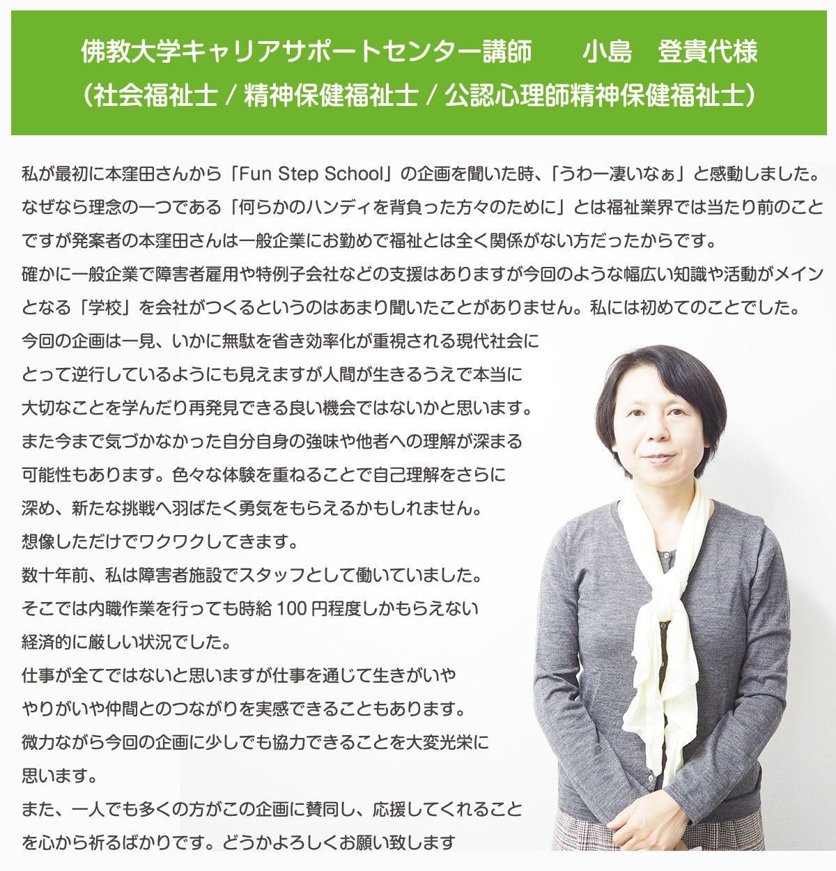 「Fun Step School」は家から出られない引きこもりの方が、「自分と向き合い自信を持ち、社会活動できる人材になる」ことを最初の目標にしています。本プロジェクトをご覧いただき、一人でも多くの方にご共感・ご支援いただければ幸甚です。