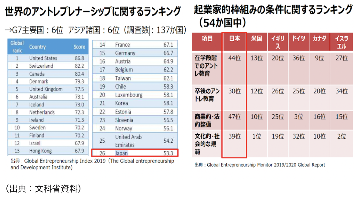 このように、我が国は他国と比べて起業に関して圧倒的に遅れていると言わざるをえない状況にあり、その原因として学校教育におけるアントレプレナーシップ教育が提供されていないこと、起業家と出会う機会がないことなどが指摘されています。