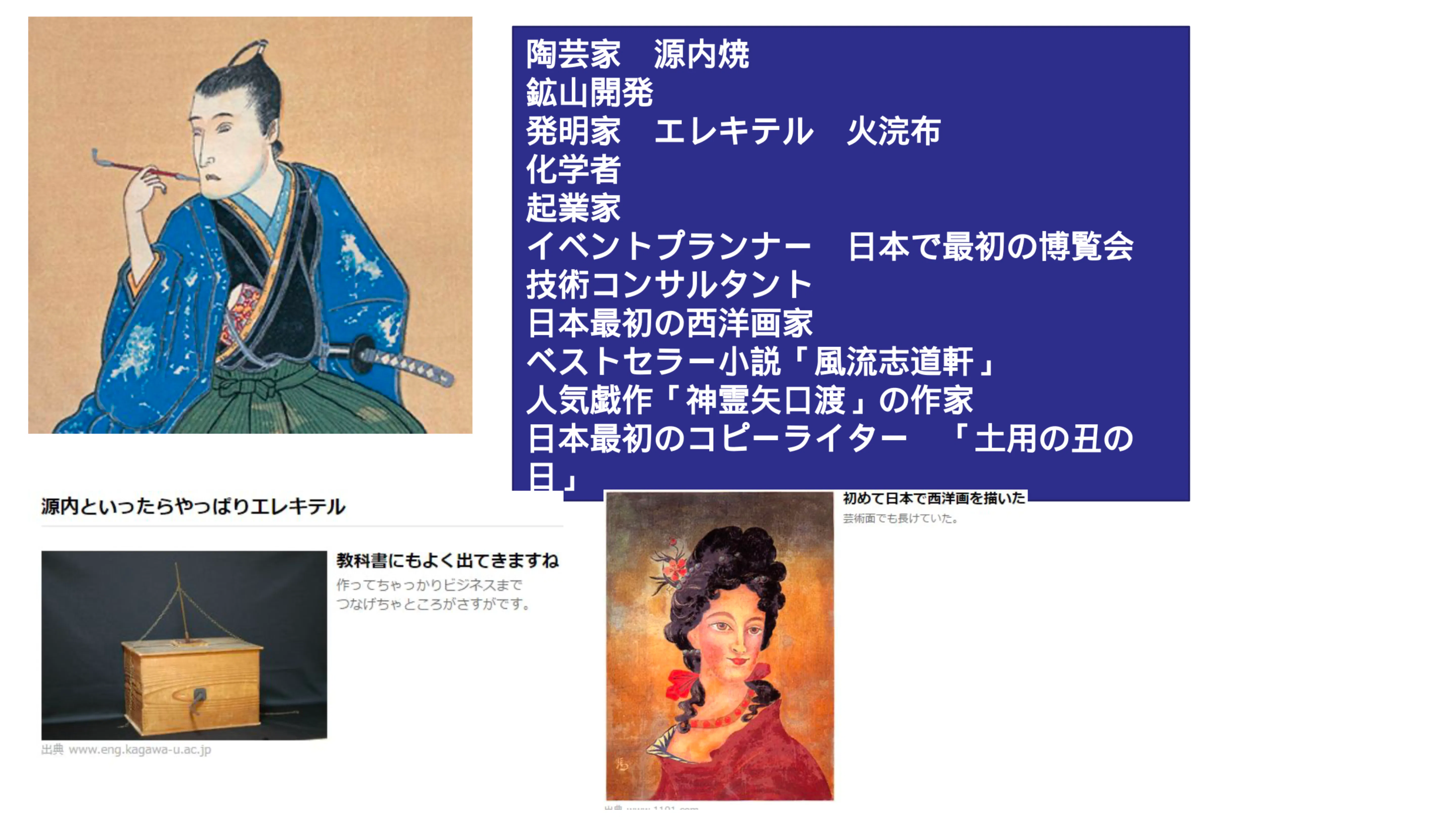 平賀源内といえばギフテッド著名人として代表的な一人で、彼が遺した功績はまさしく国益の為に走りきったことで有名です。