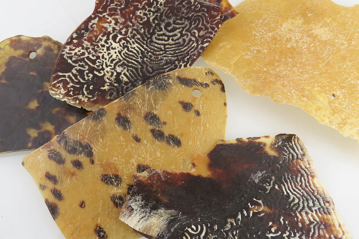 べっ甲は亀の甲羅が材料です。金属などとは違い、軽くて柔らかい素材ですので貴金属に接触、摩擦すると傷がつく恐れがあります。また、高温には弱いので強いライトの直射は避けてください(太陽光は問題ありません)