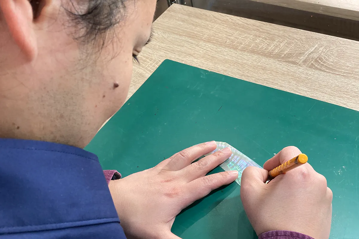 製作は、まずべっ甲を重ねてつくるところからはじまります。べっ甲はタイマイ(海亀の一種)の甲羅からできており、甲羅を重ねて、なかに含まれる膠の成分によって張り合わせてつくります。一枚の使える甲羅は極薄く、何枚も重ねることで出来上がったべっ甲の土台に、螺鈿の職人さんが小さく切った蝶貝を本漆でひとつひとつ貼りこんでいきます。