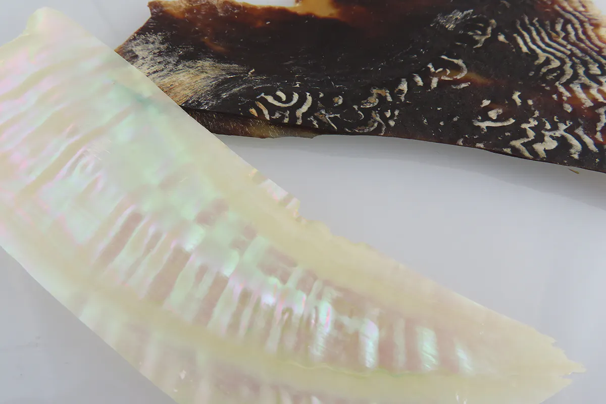 貝の螺鈿工とべっ甲は同じ海から生まれたという共通する部分もあり、相性はとても良いのです。