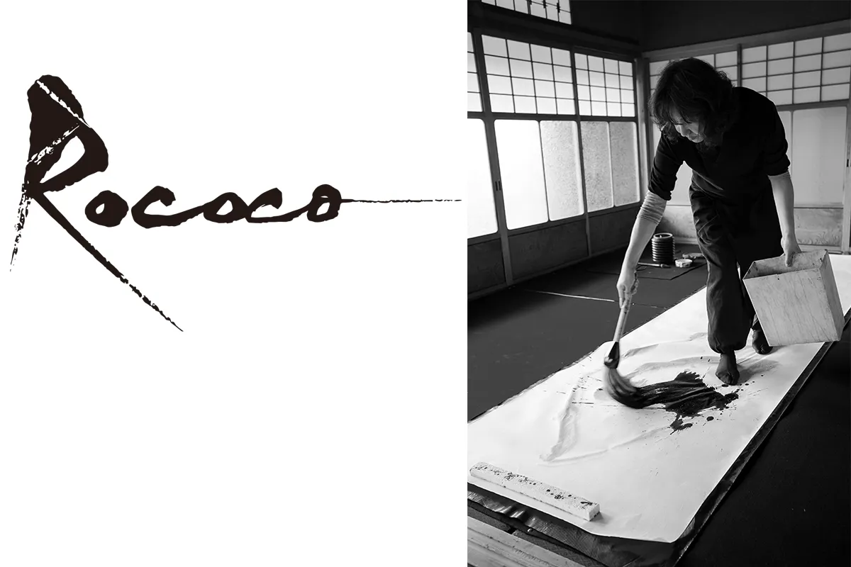 イマタニさんもまた、奈良の地で伝統的な墨を画材として新しい表現を模索しなながら活動しているアーティスト、Rococoのブランドロゴを力強い筆運びで描いてくれました。