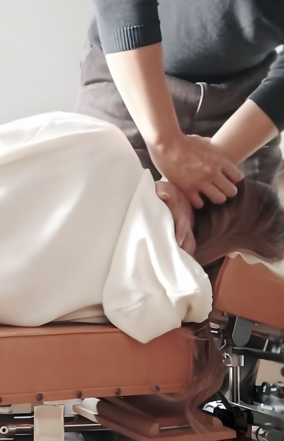大後頭関節の可動性・各関節可動域・筋肉の硬さ・皮膚感覚の違い・ナーボスコープによる脊髄神経の温度・状態を測定し、調整の必要の有無と方向性を確認します。 その結果の説明に納得し、同意を頂きましたら調整を行います。 専用ベッドにて上部頚椎をアジャストメント(調整)を瞬間的に行います。 1回の施術は40分間です。