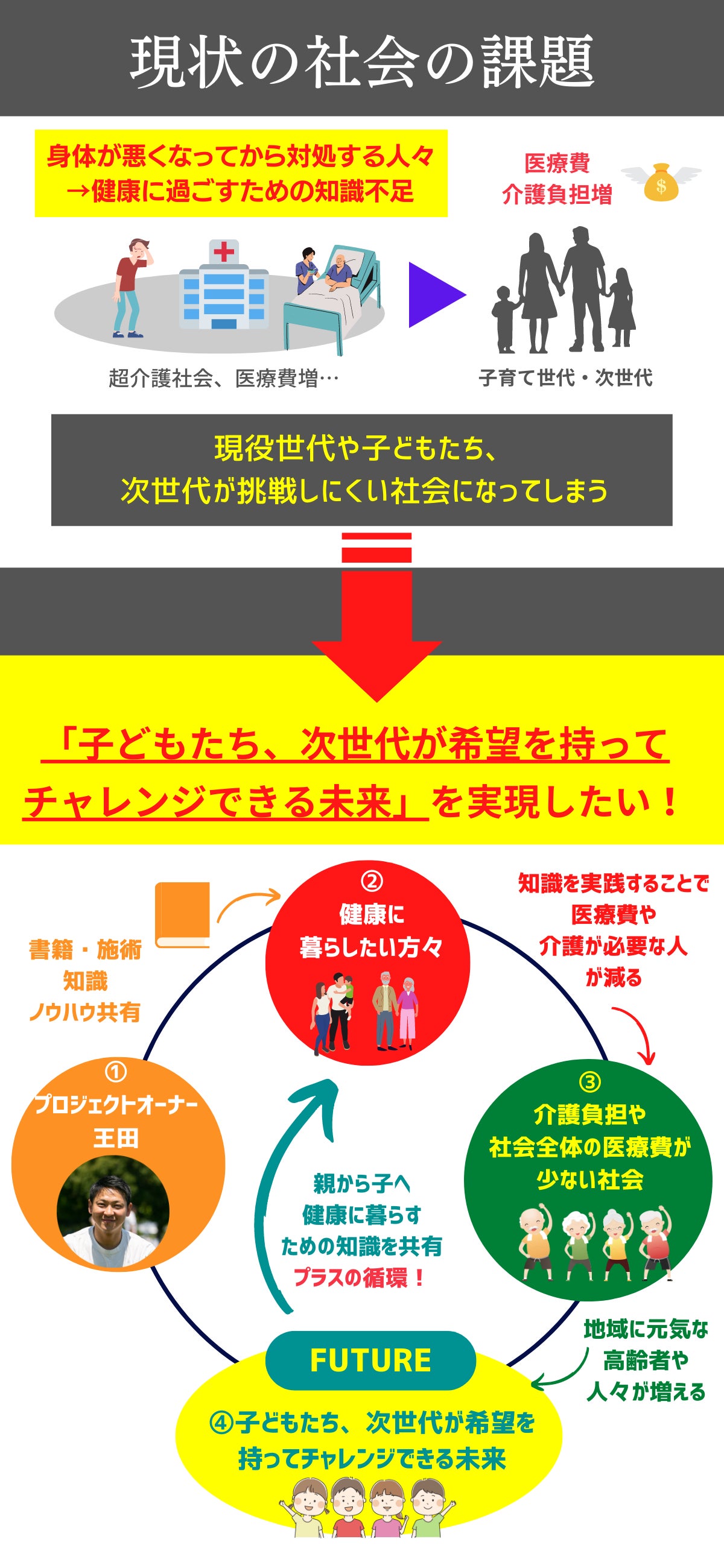 これらの経験からわかった、『未来を変える健康力(仮)』という電子書籍を出版したいと思い、このプロジェクトを立ち上げさせていただきます!