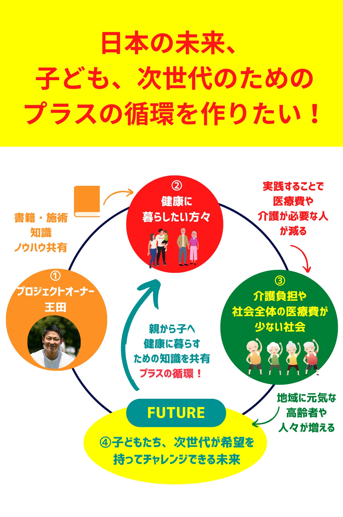 お子様がいる保護者のあなたが健康的であり、具体的な未病の改善方法がわかっていれば、お子様にも「こういうところを気をつけた方が良いよ」と伝えていくことができますよね。そのお子様が親になったらまたその子どもに伝えてもらえればとても嬉しいのです。そういうプラスの循環を作っていきたいと思い、このプロジェクトを立ち上げました!