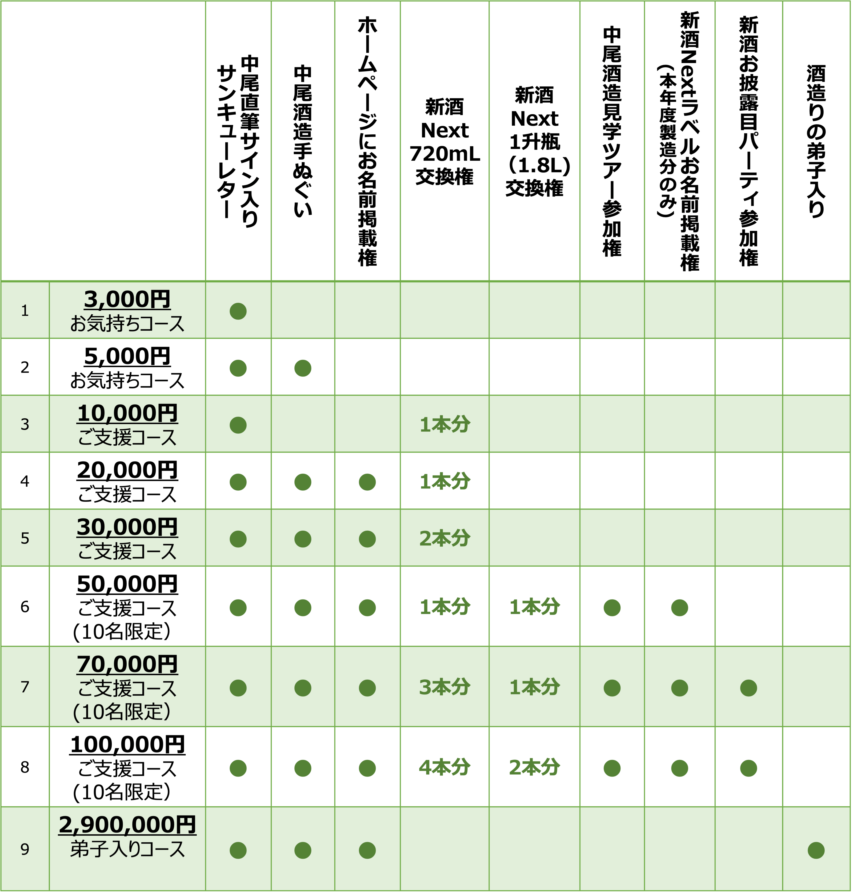 今回リターンではお気持ちとしてご支援頂くコース、新酒Nextをご賞味頂けるコースを金額ごとにご準備しました。