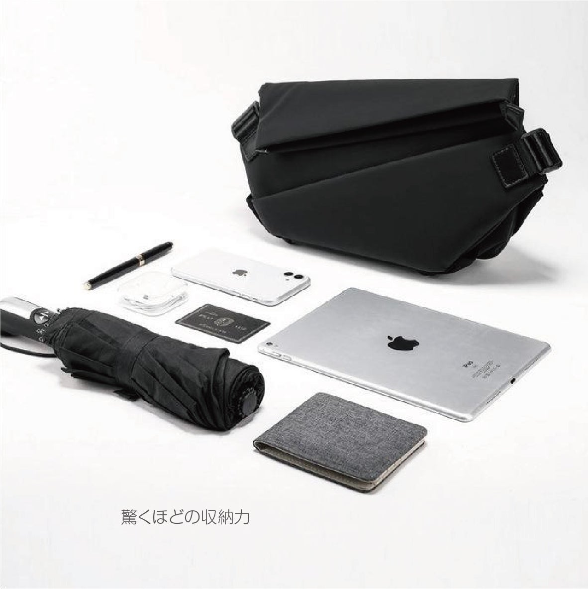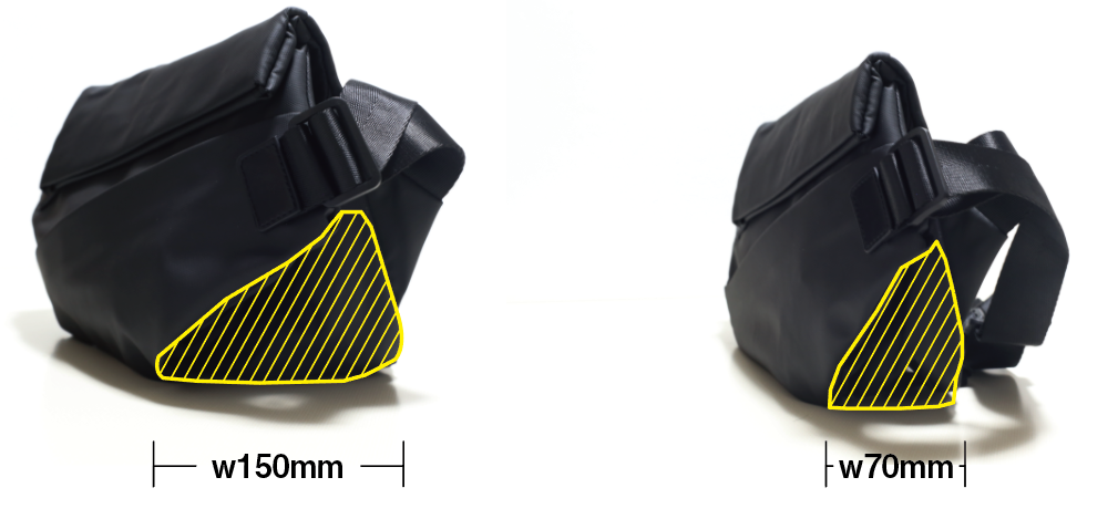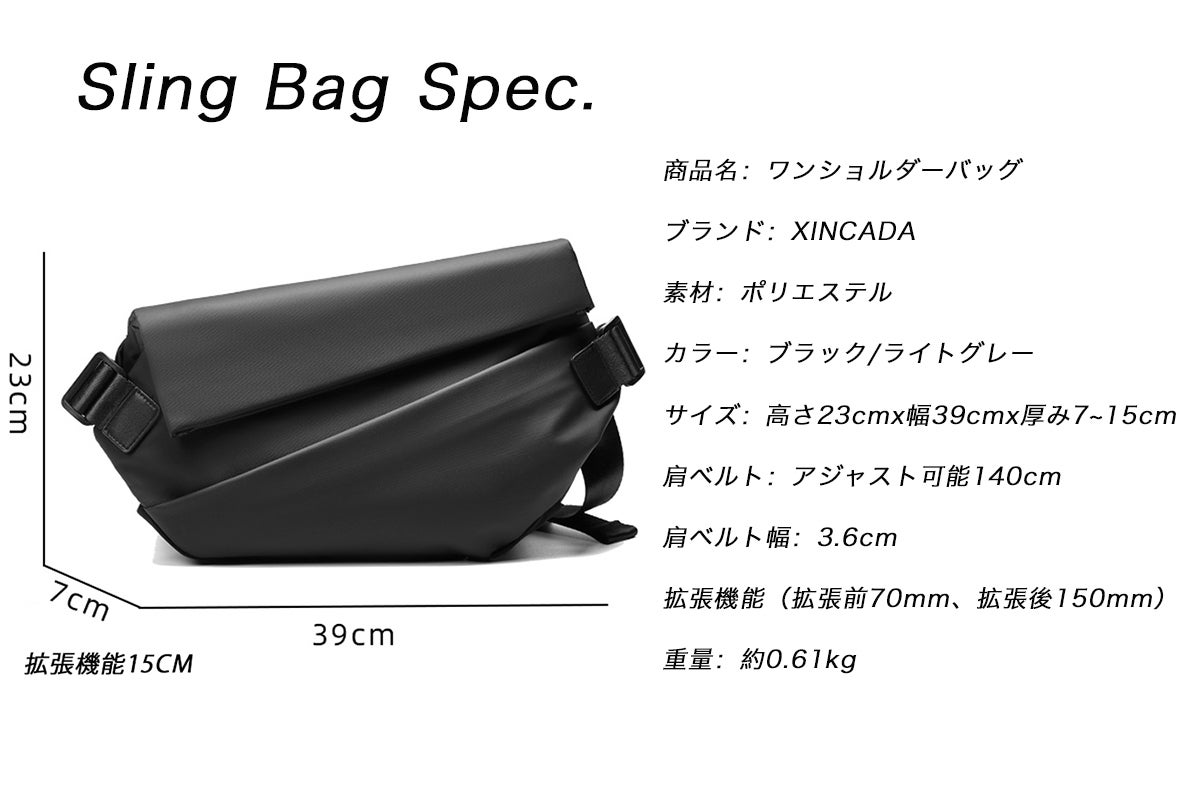 ◯スリングバッグなのに、優れている拡張機能で約8cmも広げられ、程よい収納力を実現!たくさん収納できて、お出掛けこのバッグ一つ!