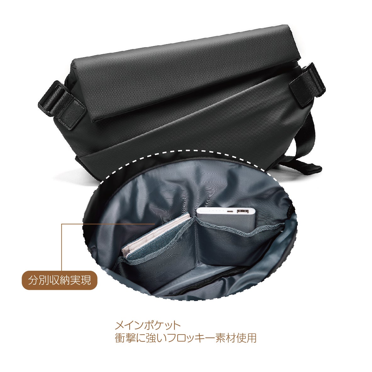 ◯ワンショルダーバッグ感覚で多層収納力、メンポケット中に分別ポケットによる小物を収納可能となり、速やかに出入を可能となります。