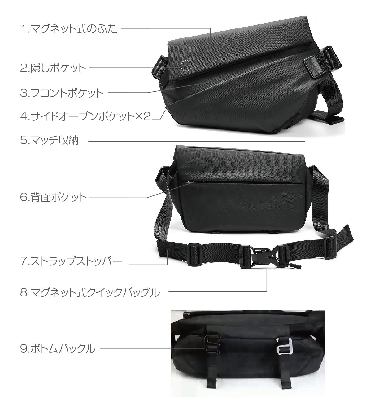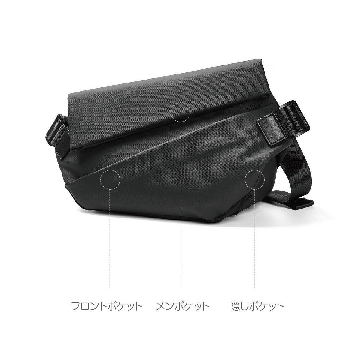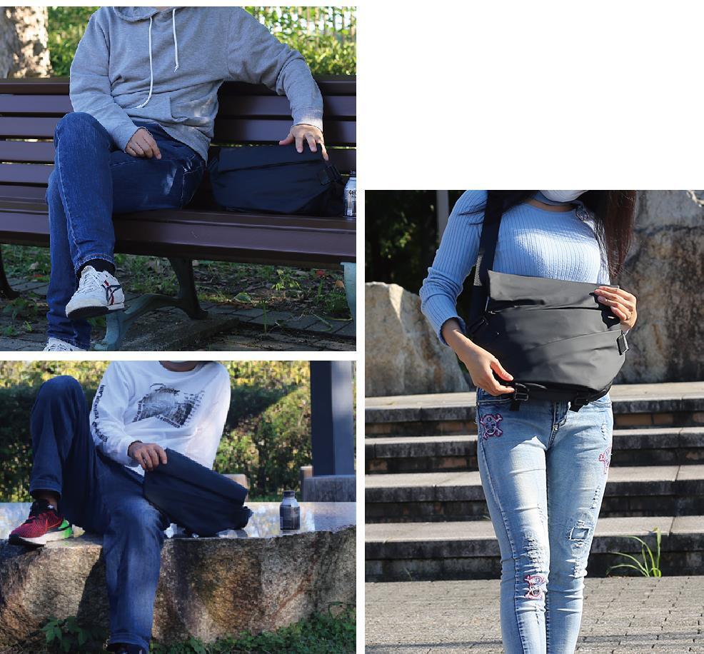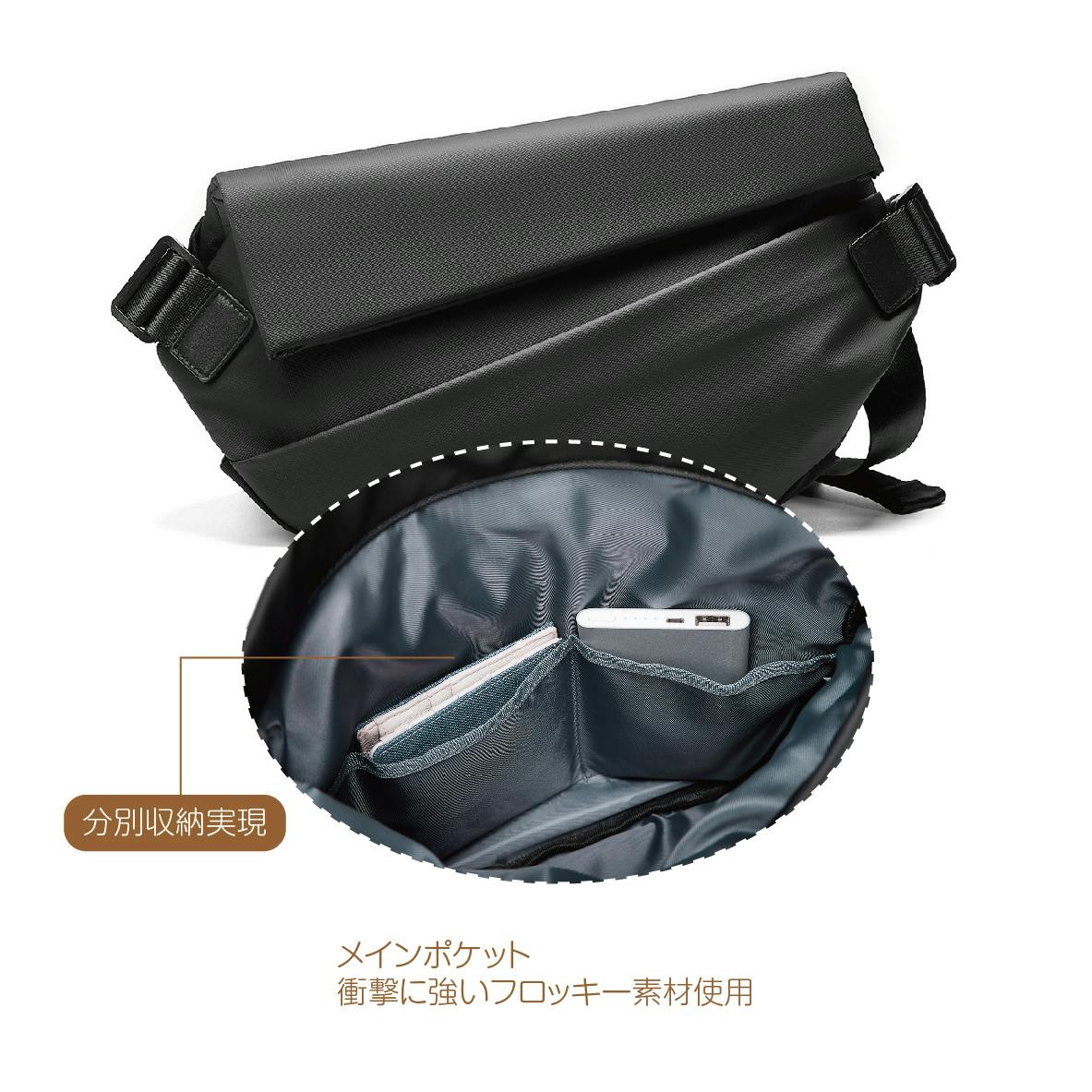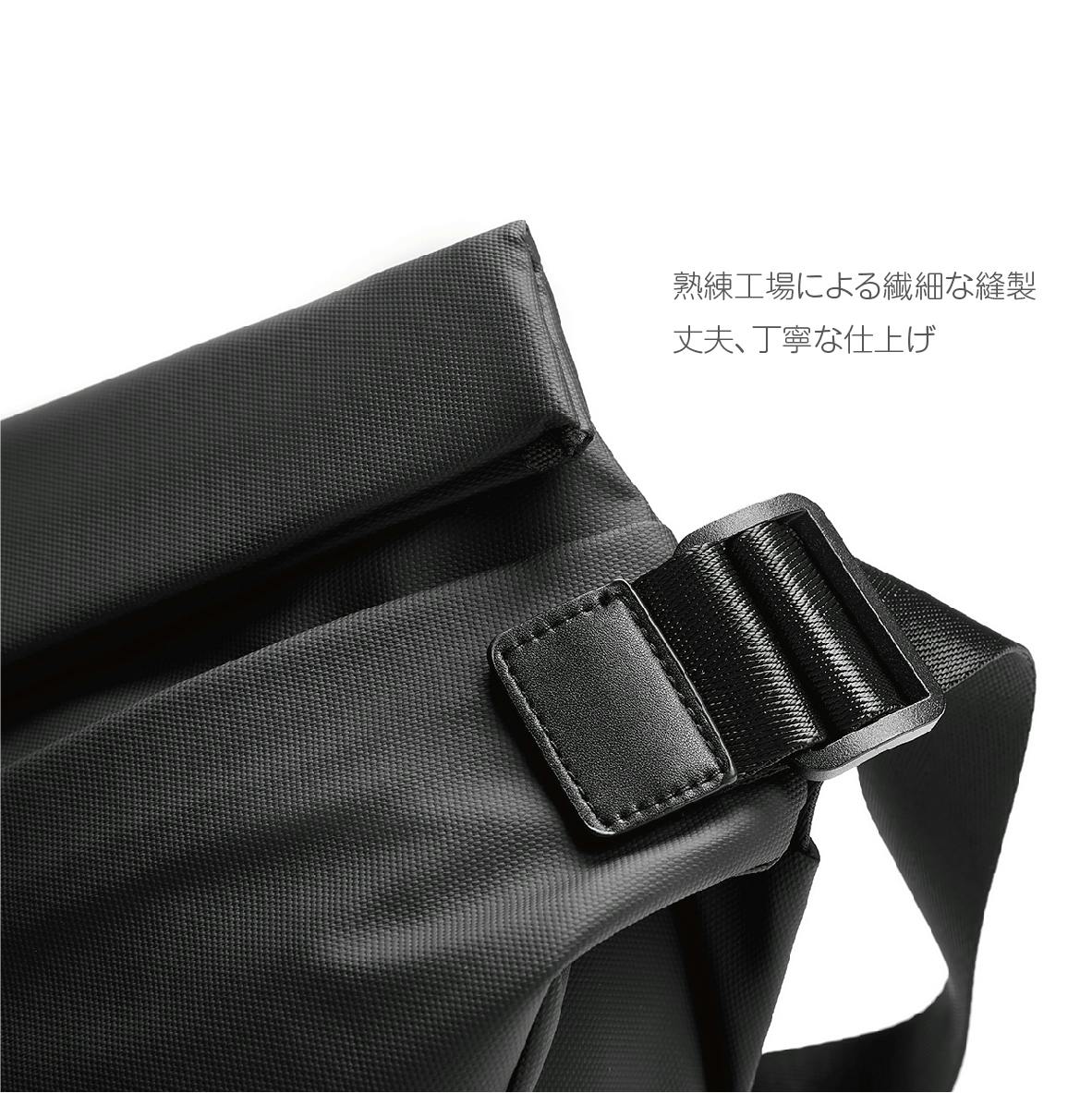 ◯便利な外部ファスナー式ポケット、ボディバッグの裏面にはファスナー式ポケットが付き、頻繁に出し入れの小物(眼鏡、ティッシュ、ハンカチ)など日用品小物入れを分けて収納でき、出張や旅行時に役立ちます。