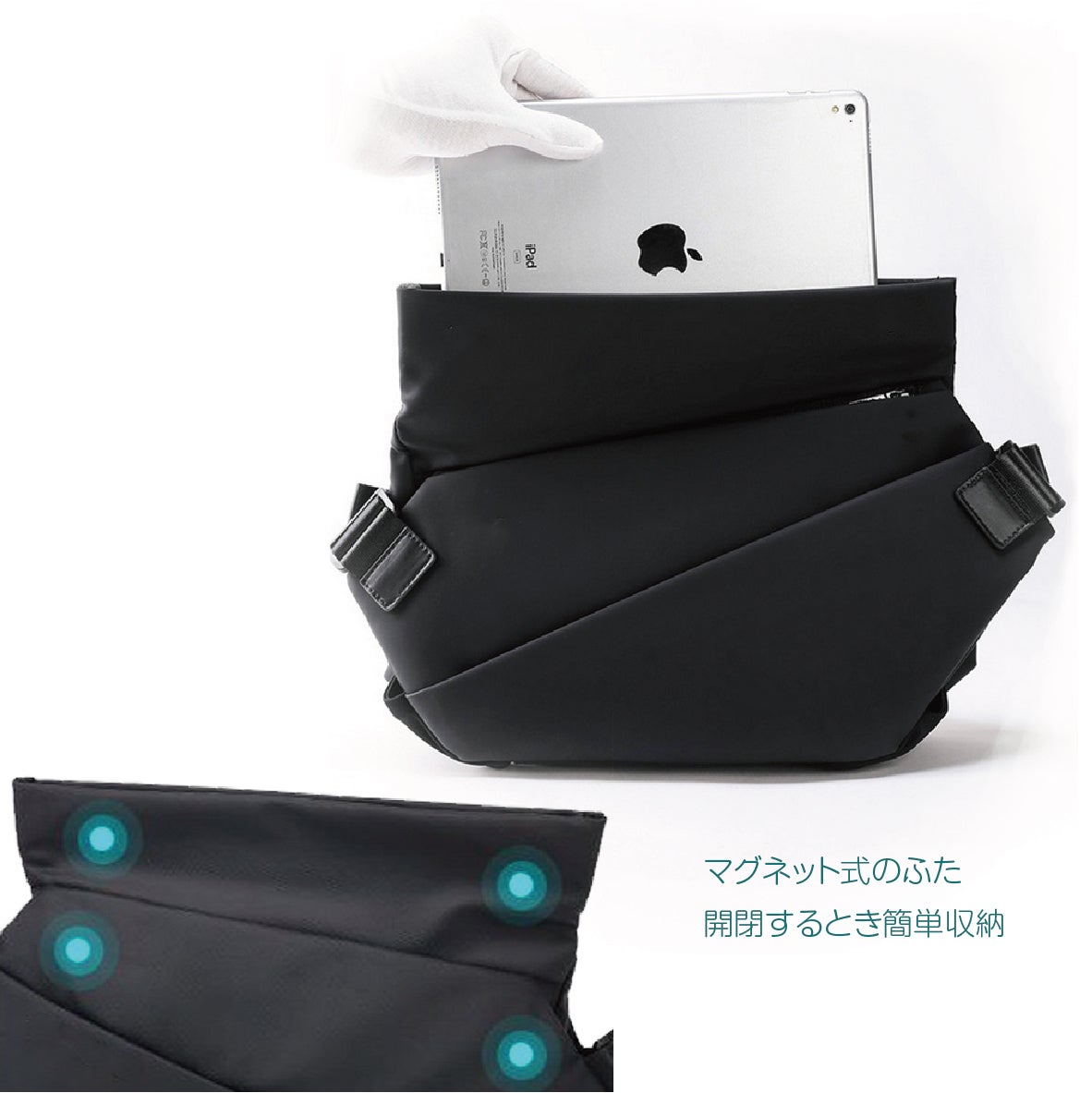 ◯マグネット式隠ボタンを設計、ボタンが見えないので、程よい力で開閉することも簡単、もちろんしっかり締められます。