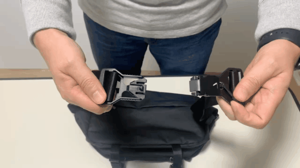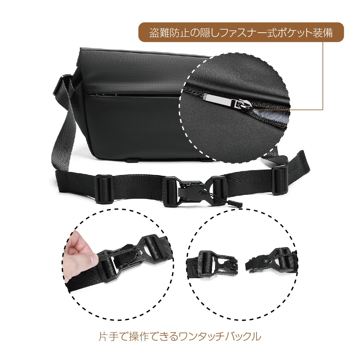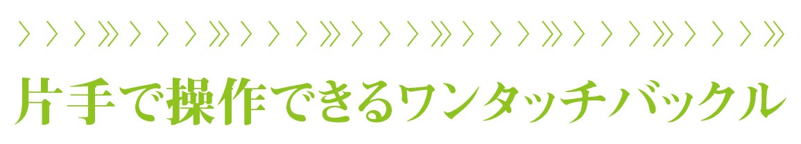 ◯片手で操作できるワンタッチバックル搭載、引っ張っても開けない安心感。