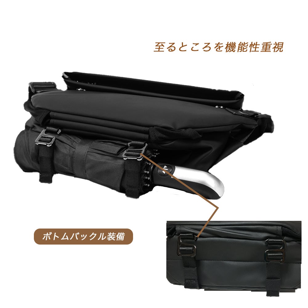 A:ボトムに専用のバックルが付き、折りたたみ傘収納可能、濡れた傘でも安心です。