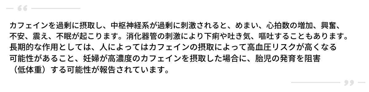 カフェインの過剰摂取については下記のような危険性が指摘されており、注意喚起されていることは多くの方が知るところでしょう。