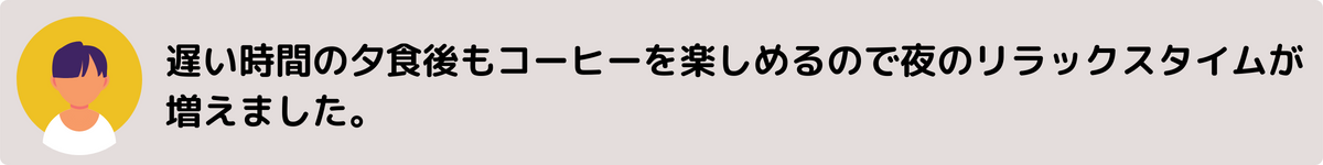 しかも、カフェインレスコーヒーにしたことで、夜寝る前のリラックスタイムにも大好きなコーヒーを味わうことができるのです。
