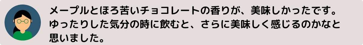 「優しいメープルとビターチョコレートの香り」がプラスされた、甘さを抑えたビターな大人の香りが人気のビターチョコレート。ミルクや牛乳とも相性抜群!まるでチョコレートドリンクのような香りのカフェオレが楽しめます。