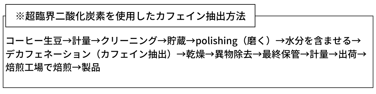 物質の液化・気化現象を利用して、狙った物質(カフェイン)を正確に除去するため、コーヒー本来の味わいや風味が損なわれず、安全性も高いと言われています。