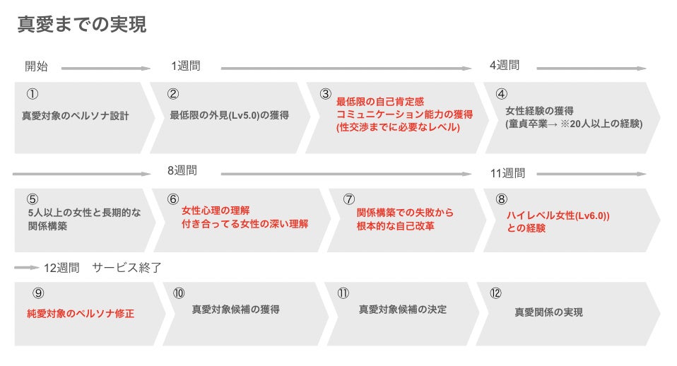 ④の「目標経験人数」は加入する前の状態と真愛対象の外見レベルや特徴をどこに定めるのかにもよります。大体20人ほどの女性で、毎回の振り返りを徹底すれば、真愛にたどり着けられると考え、仮設定しております。