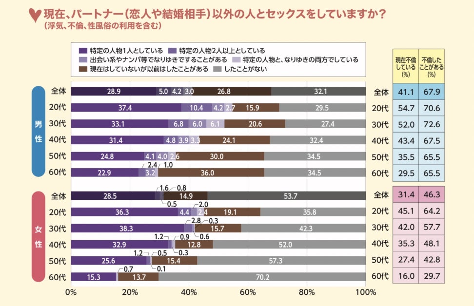 これは、多くの夫婦・カップルにおいて、67.9%以上の男性、46.3%以上の女性が、他の相手と関係を持ったことがあるというアンケート結果が証明しています。