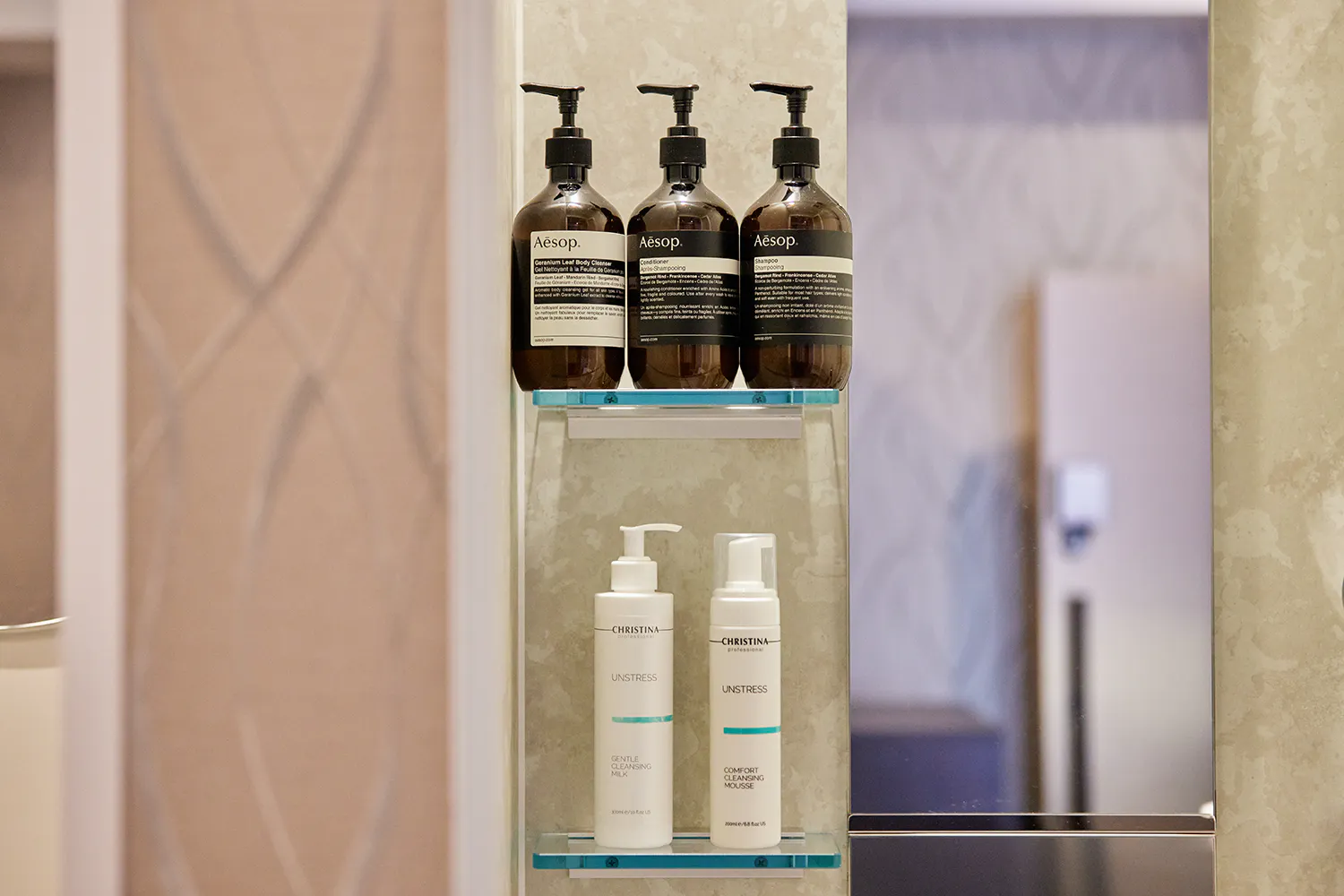 シャンプー、トリートメント、ボディーソープはイソップ。基礎化粧品にはメディアにも話題のクリスティーナをご用意 。また、ドライヤーは【KINUJO】を設置しております