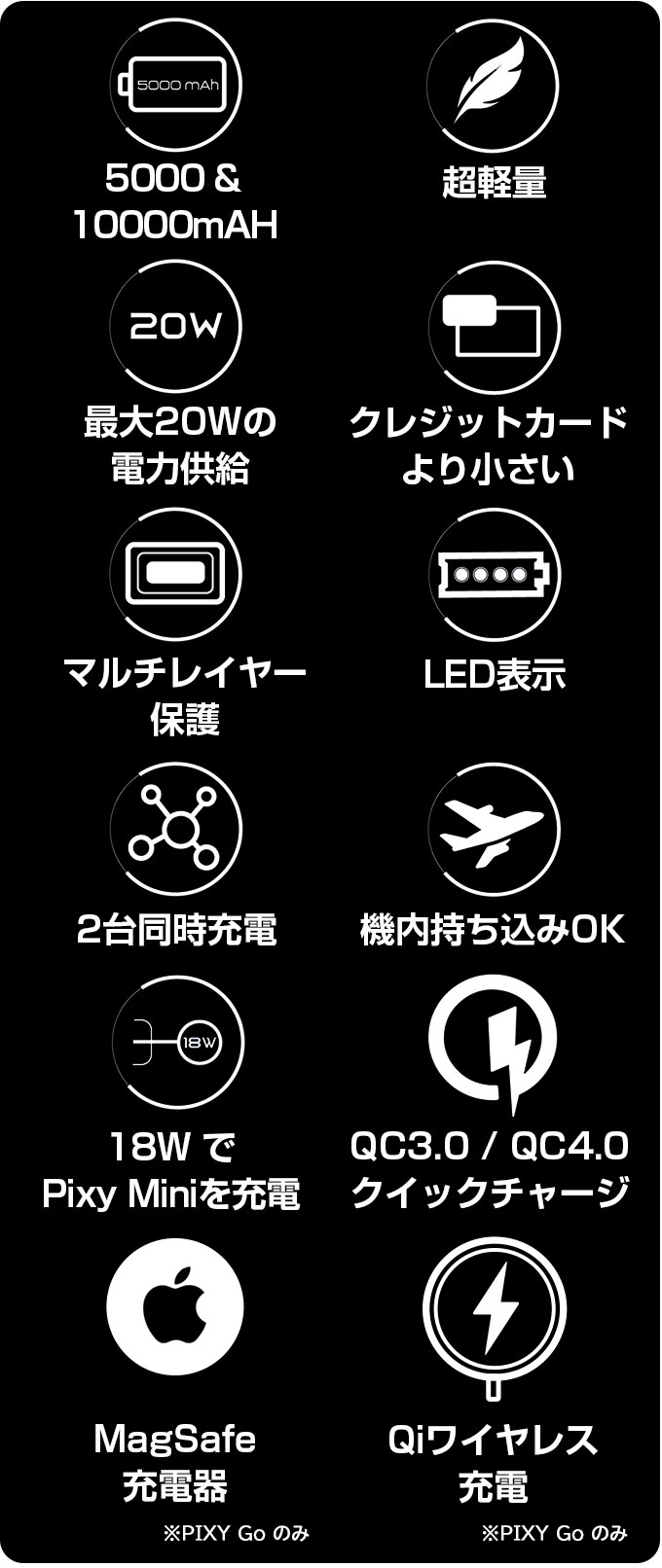 Pixy Go は MagSafe および Qi ワイヤレス対応で、デバイスを最大15Wまでワイヤレスで急速充電(※2)できます。