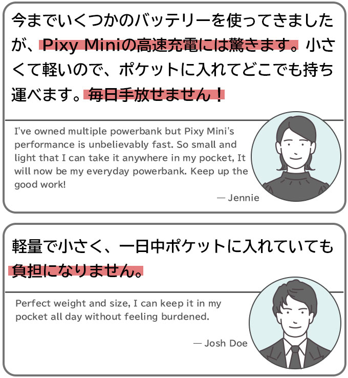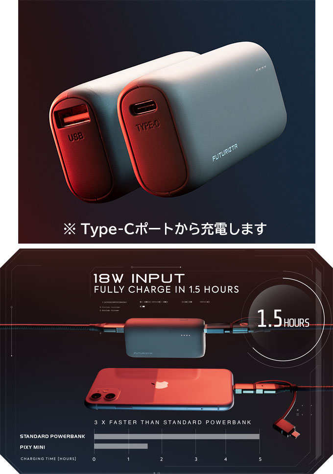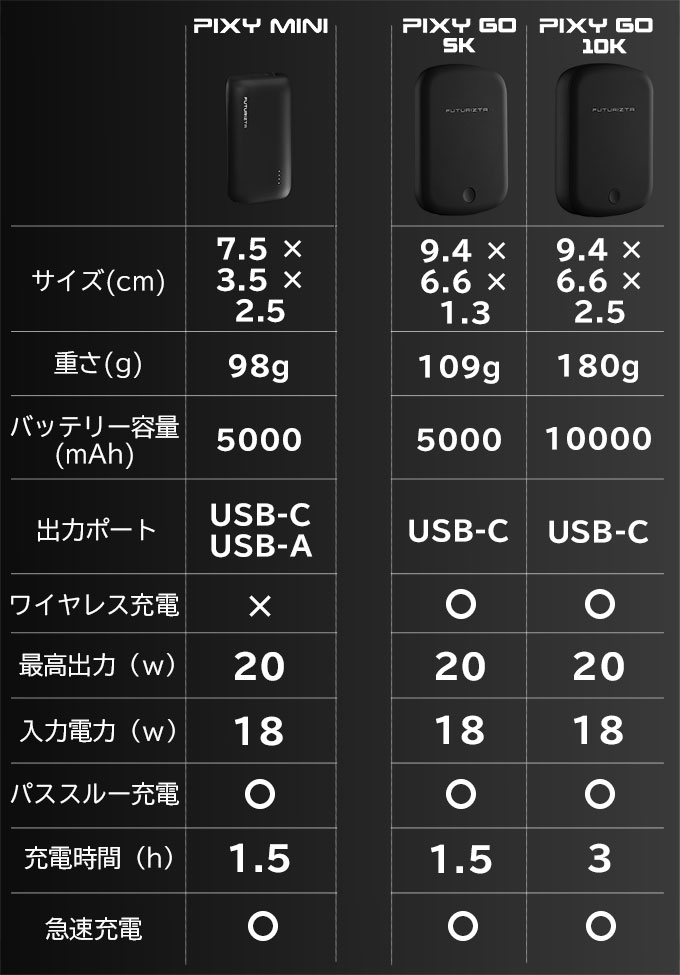 Q:PIXY MINI と PIXY GO 本体の充電時間はどれくらいですか?A:PIXY MINI と PIXY GO 5K は 1.5時間、PIXY GO 10K は 3時間ほどです。