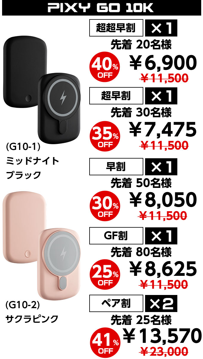 Pixy Go 5K のフル充電には、1.5時間、Pixy Go 10K のフル充電には、3時間 しかかかりません。