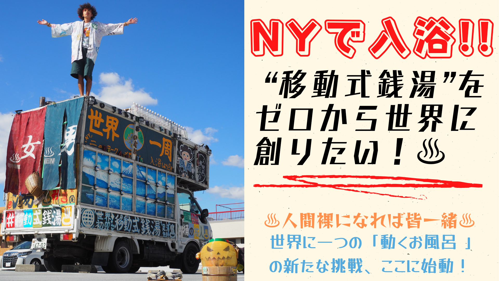 『トラックの上にお風呂とサウナを搭載した世界に一つの“移動式銭湯”を再びゼロから海外に創り、前人未到の“お風呂でのアメリカ大陸横断”を果たし、人種・国境・あらゆるしがらみ全てを乗り越え日本の湯で世界中の人々とNYで入浴を叶えてみせる』