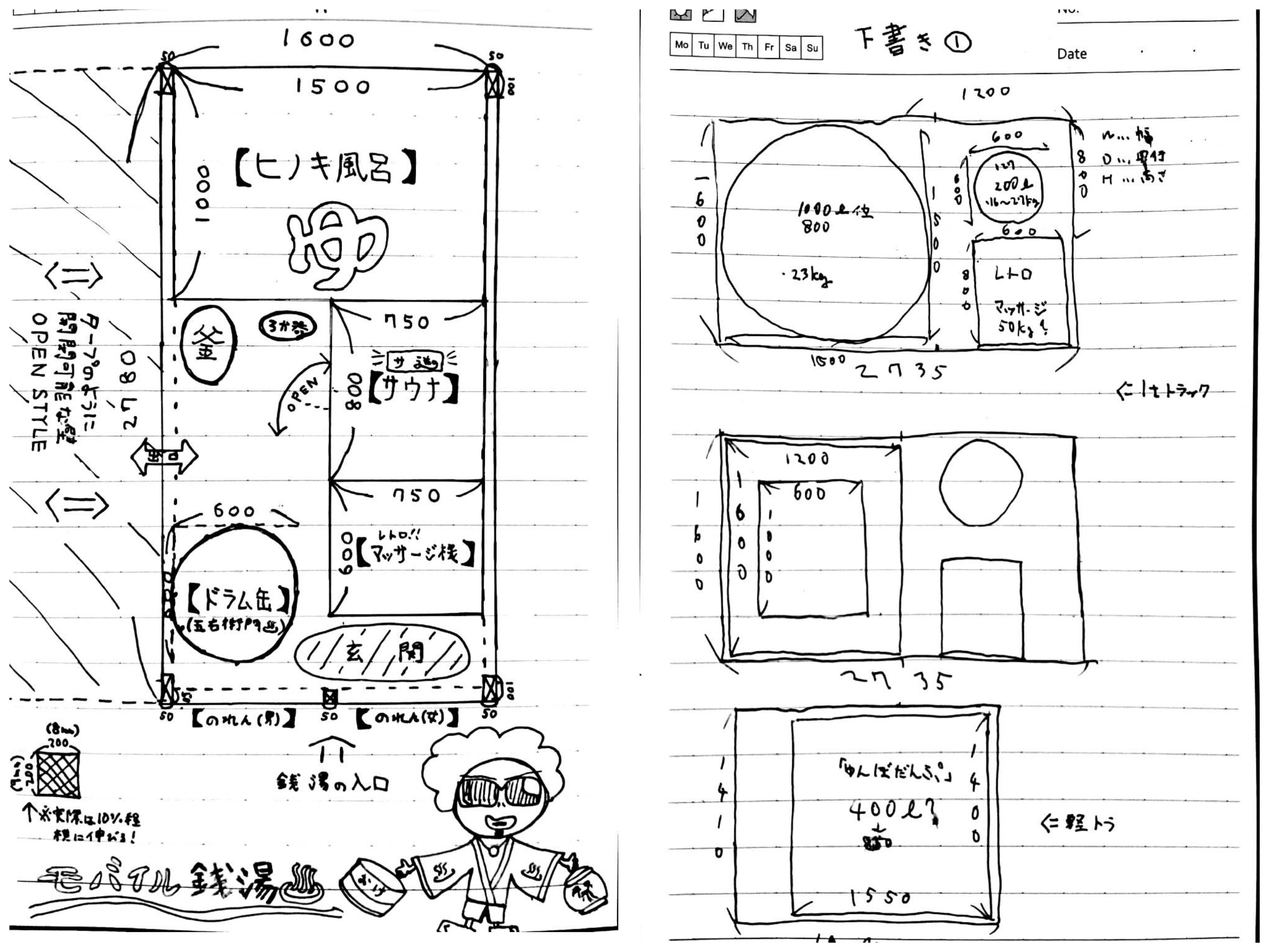 ▼当時描いたモバイル銭湯の設計図。大雑把styleその年の11月に人生初となる車を気合いで購入