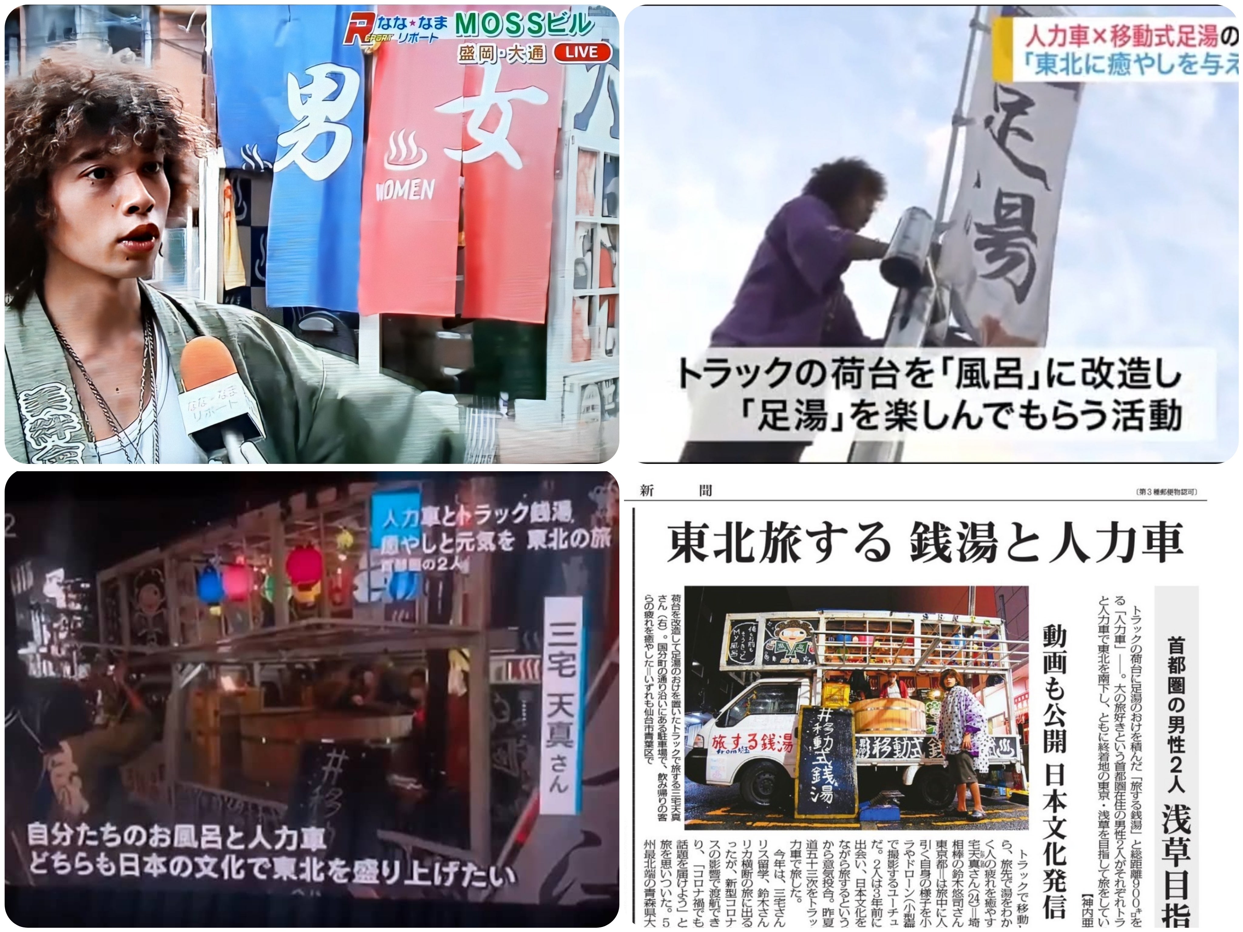 ▼今や伝説、移動式銭湯、移動できなくなる事件人力車で地球上を走って旅するガンプ鈴木という親友と東北の三陸沿いを「旅する銭湯」として巡ったり…