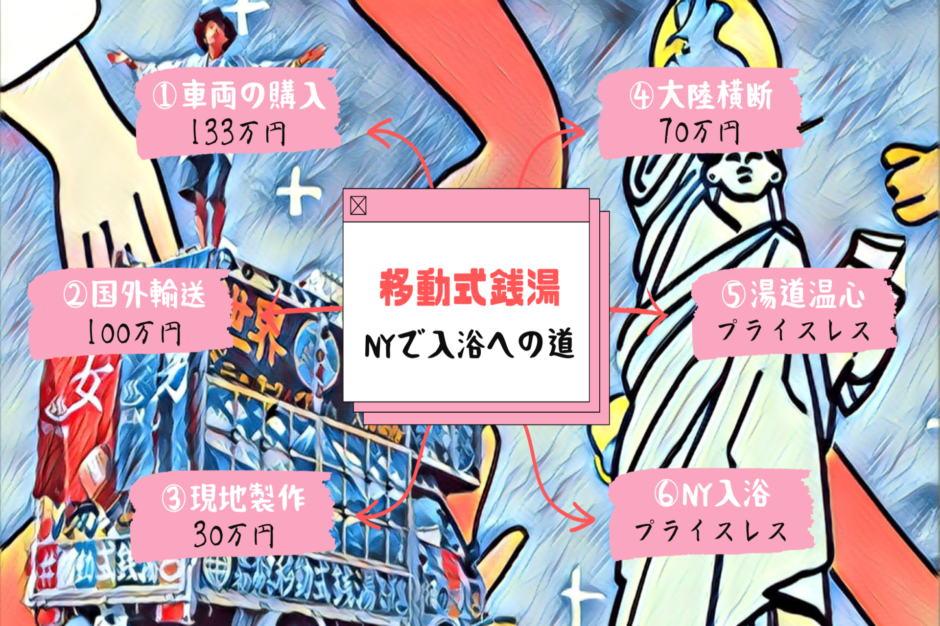 (今の移動式銭湯で既に使っている檜風呂を車と共に輸送することで新たなお風呂購入費用を抑えます)