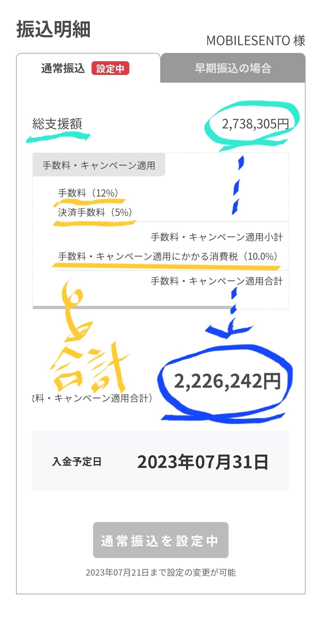 2023/06/23 07:00プロジェクト終了から早三日、改めてこの度はこの挑戦を応援して下さり本当に本当にありがとうございました!今回は本プロジェクトで集まった資金の明細の共有です。(既にプロジェクトオーナーを経験済の多くの先輩方には不要な情報かもしれませんが、この先プロジェクトを立ち上げる方にとって何かしらの参考情報となるかなと思いましたので記します)①今回集まった総資金が2,738,305円②そこから諸々の手数料(※画像参考)である512,063円を差し引いて…③最終的に直接自分がプロジェクトに使える金額が2,226,242円────となります。(実際にはリターン原価等がかかるのでもう少し使える金額は低くなりそうです…!!)※また、今回は通常設定の7月末振込の場合ですが、これを「早期振込」とするともう少し手数料は高くなり、使える金額は2,075,636円となります。…今はご支援下さった方々への連絡やリターン準備等を進めつつ、同時にプロジェクトの次の準備も動き始めている段階です。不足分の資金面の問題もまだまだ解決しなければなりませんが、ひとまず現状で動き出せる手段から一歩一歩気を引き締めて駒を順に進めて行けたらと思います。まだまだ未熟なこんな自分ですが、今後ともどうぞ宜しくお願い致します!!!2023.6.23移動式銭湯 三宅天真 もっと見る