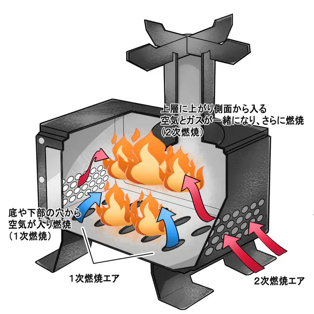 2次燃焼システムは底にある穴から空気を取り込み燃焼(1次燃焼)し、空気が上層に上がります。その際に側面から入り込む空気とガスが一緒になり、再度燃焼(2次燃焼)される仕組みにより、効率よく燃焼します。