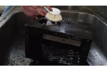 ストーブ本体やその他パーツは中性洗剤でブラシ等で磨いてすすや灰を落とします。