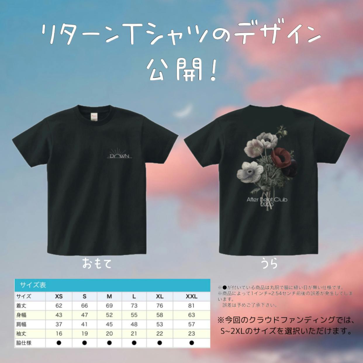 2022/12/24 13:27大変お待たせ致しました!アフタビ公式Instagramにて公開されていたリターンTシャツのデザインとサイズについてお知らせ致します!おもては公演ロゴのシンプルなデザイン、うらはアネモネの花をあしらったデザインになっています。私たちの世代は、コロナによってサークル活動が度々休止になり、暗い夜のような時期をたくさん過ごしてきました。しかし何度も公演の開催を信じ、日々練習に励んだことは決して無駄ではなかったと思っています。アネモネは「見放された」など暗い花言葉のある花ですが、その中でも美しく華やかに咲き誇る姿に、アフタビを重ねました。実は、白いアネモネの花言葉には「希望」というものもあります。これからのアフタビに明るい「希望」がありますように、という思いも込めました。Tシャツのボディはスミクロになっています。グレーに近い黒で、古着のようなヴィンテージ感のある色味です。サイズにつきましては画像の表をご覧下さい。そしてついに、今月20日にクラウドファンディングの目標金額を達成致しました!たくさんのご支援、本当にありがとうございます!11月から始まったクラウドファンディングも残り1週間となりました。引退公演に向けた練習も始まり、サークル員は日々練習に励んだり、構成やイメージについてたひだび議論を重ねたりしています。引退公演が無事に成功し、皆様の期待に応えられるよう、サークル員一同邁進してまいりますので、今後ともよろしくお願いいたします! もっと見る