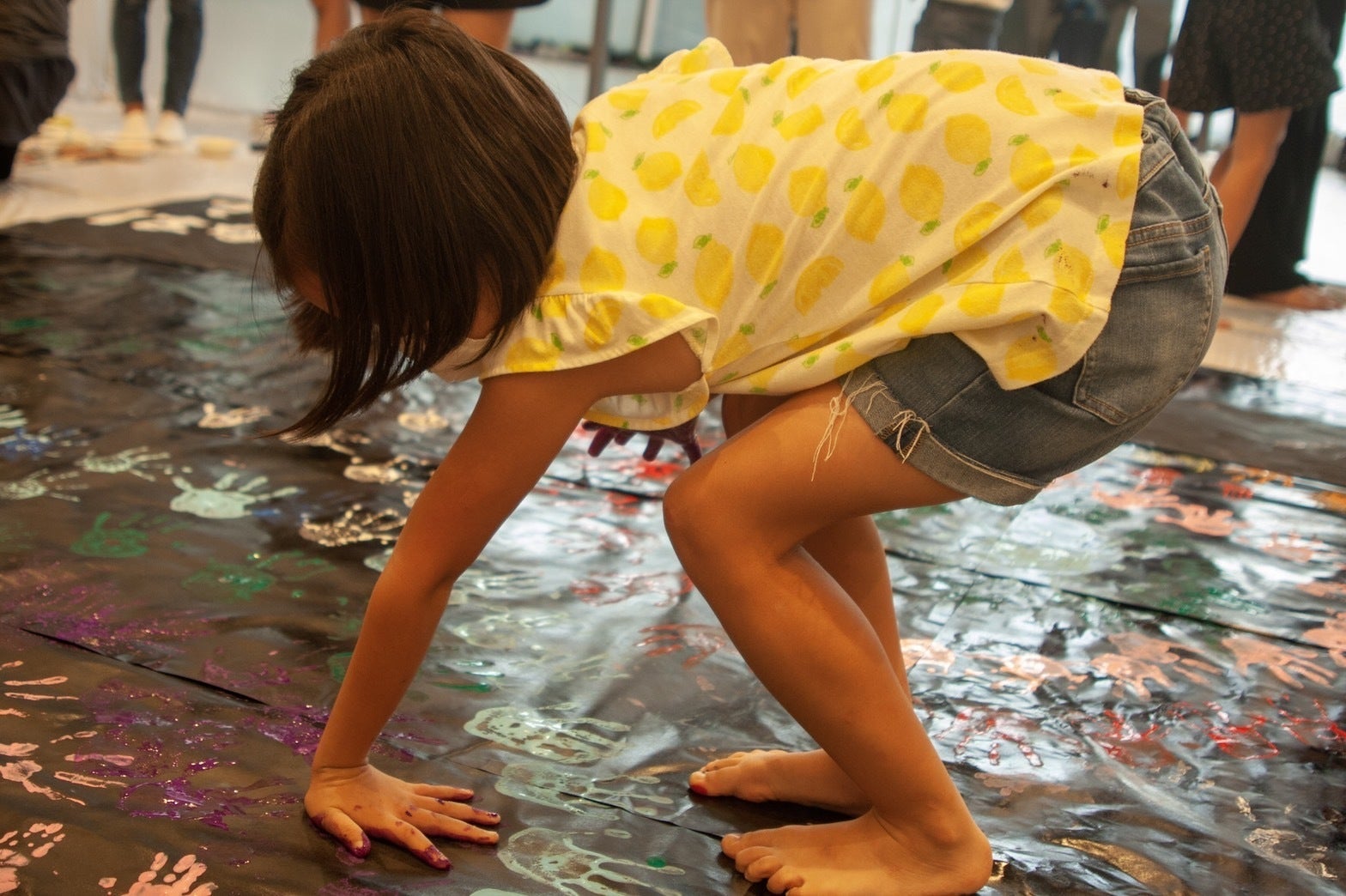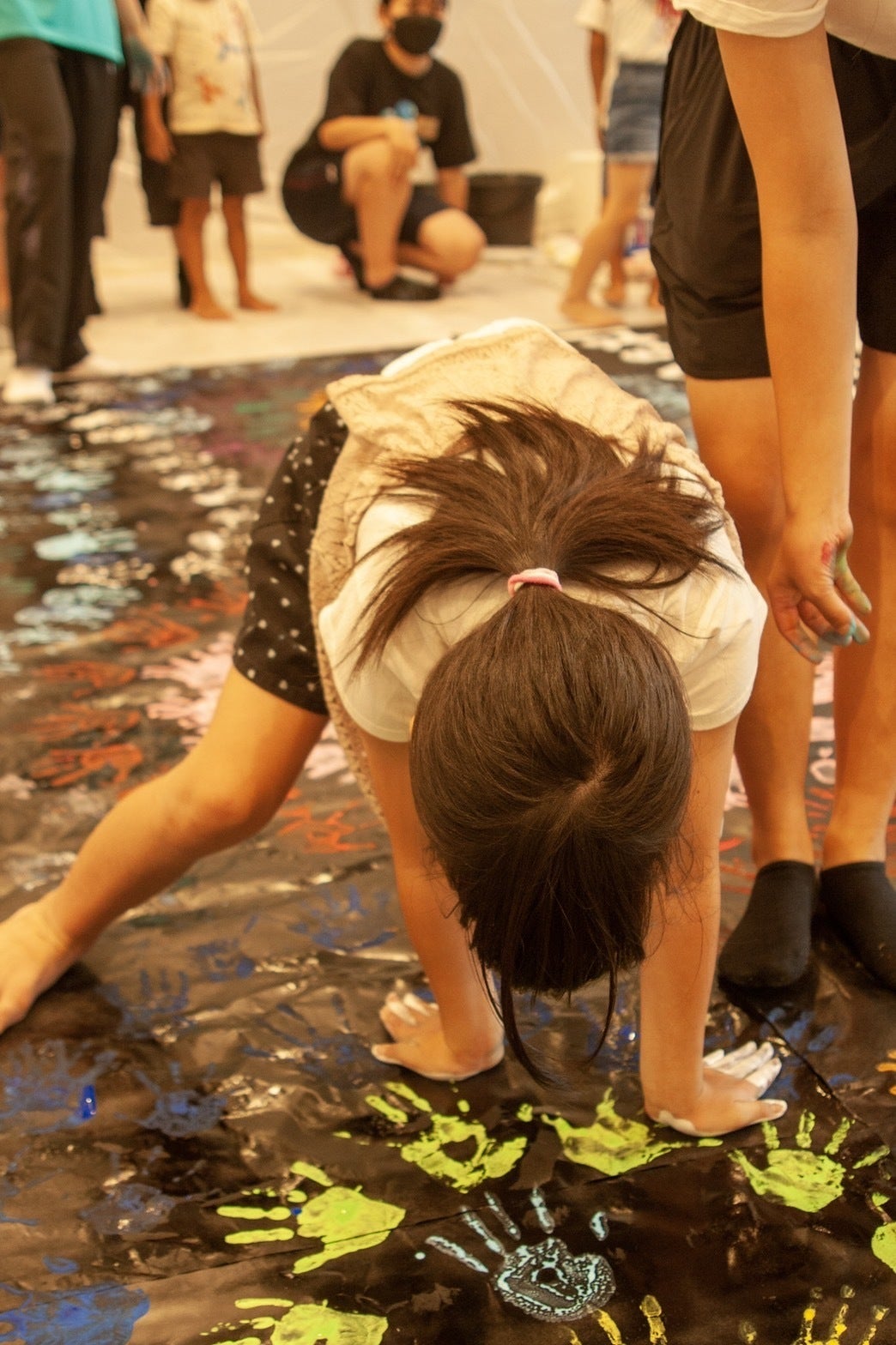 縦3メートル、横4メートルの大きな黒い紙に、絵の具を手につけた参加者が手形を押しました。