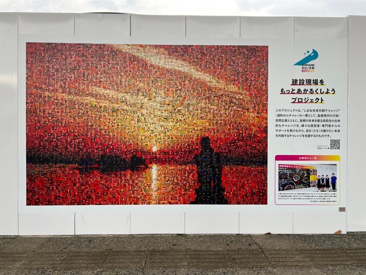 2022/12/18 14:22こんにちは!建設現場をもっと明るくしようプロジェクトです。私たちのプロジェクトに暖かいご支援をいただき大変ありがとうございます。先日、たくさんの人から写真を集めて作成したモザイクアートが完成しました。最終的に700枚以上の写真が集まり、美しい宍道湖の夕日が出来上がりました!完成したモザイクアートは、松江市総合文化センタープラバホール建設現場の白い仮囲いに掲示されています。みなさまぜひご覧ください!松江市総合文化センター プラバホール〒690-0017 松江市西津田6丁目5番44号http://www.web-sanin.co.jp/matsue/plover/hall/ もっと見る