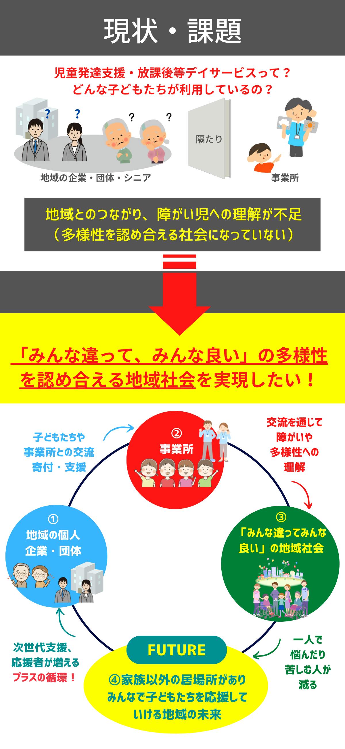 という声を地域の方々からいただきました。これまで積極的に地域との関わりをとってこなかったからなのですが、ここから「みんな違って、みんな良い」の社会づくりを実現していくために、現状を変えていきたいのです。