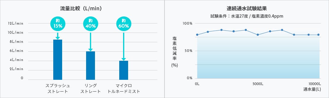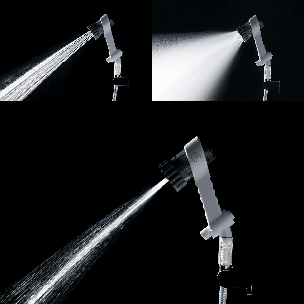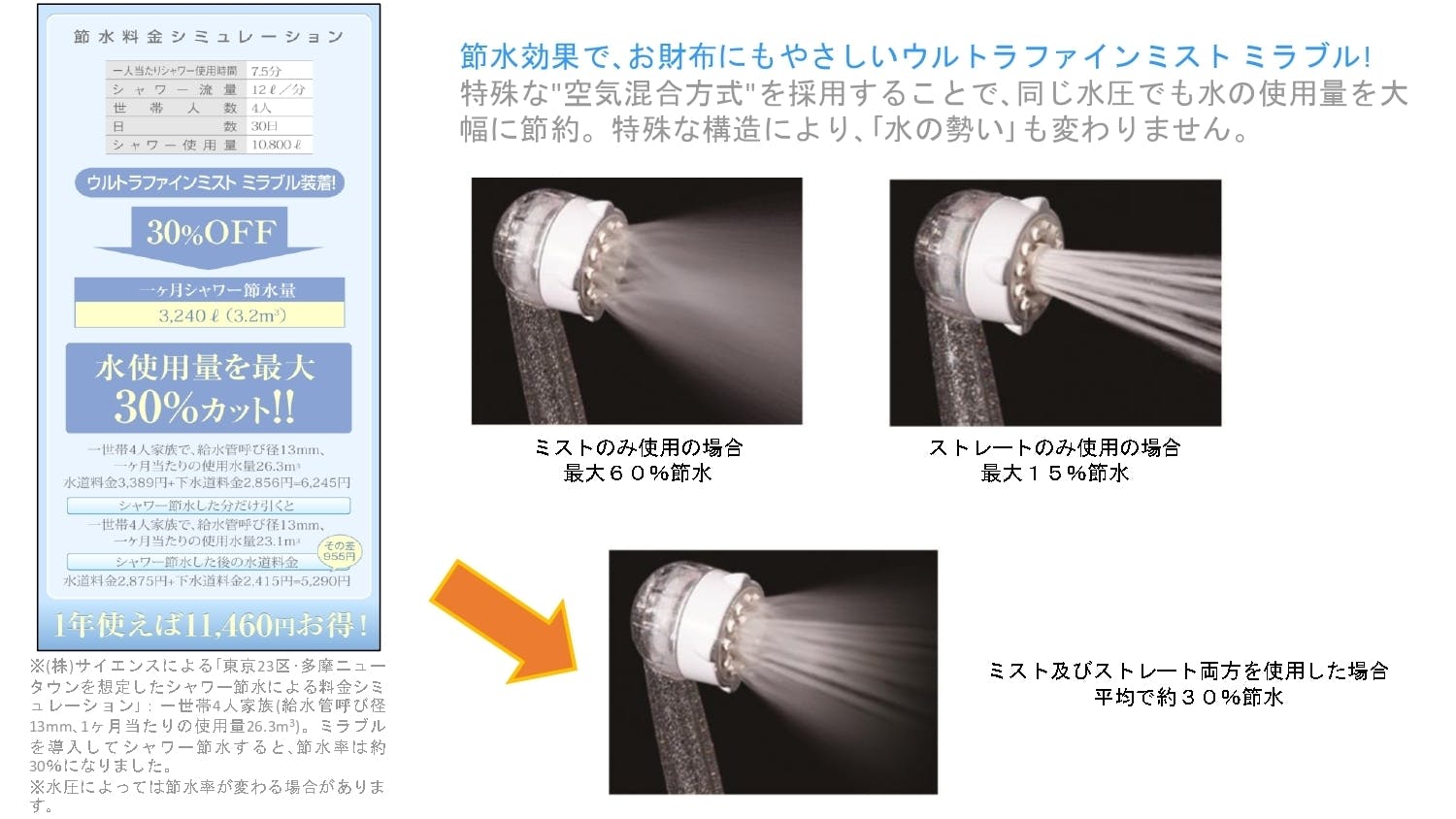 特殊な「空気混合方式」を採用することで、同じ水圧でも水の使用量を大幅に節約します。スプラッシュストレート水流で約15%、リングストレート水流で約40%、トルネードミスト水流で約60%の節水に成功しています。