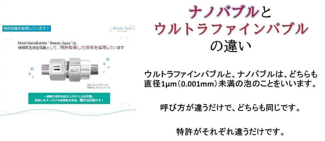 ※ナノバブルとウルトラファインバブルの違いは、どちらも直径1μm(0.001mm)未満の泡のことをいいます。呼び方が違うだけで、どちらも同じです。特許がそれぞれ違うだけです。