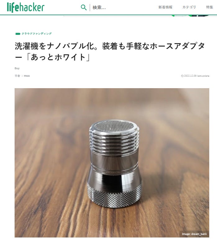 お世話になっております、株式会社ドリームバンクです。lifehackerにて、あっとホワイトについての記事が掲載されました!!なぜナノバブルが良いのか分かりやすくご紹介いただいております。わたくしどもも嬉しいです。ご検討中の方もそうでない方も、よければ以下リンクからぜひぜひご覧いただけますと幸いです。https://www.lifehacker.jp/article/machi-ya-nanobubble_adaptertart/ご質問等もお問合せフォームよりお応えしておりますので、ご支援前になにか気になることなどございましたら、どうぞお気軽にご利用ください。引き続きどうぞよろしくお願いいたします!