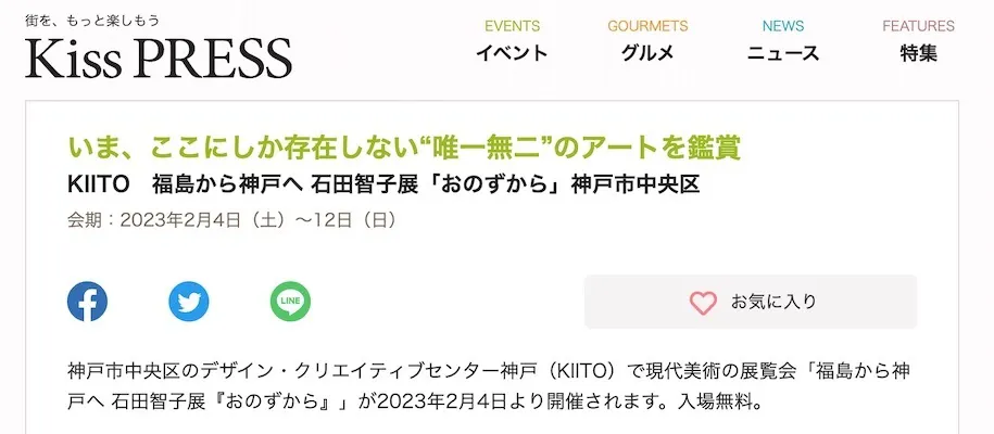 その場、その時にしか見ることができない石田さんの作品を神戸で鑑賞できるチャンス!展示される作品は同展のために新たに制作されるので、どんな作品を見るとこができるのか今から楽しみです♪