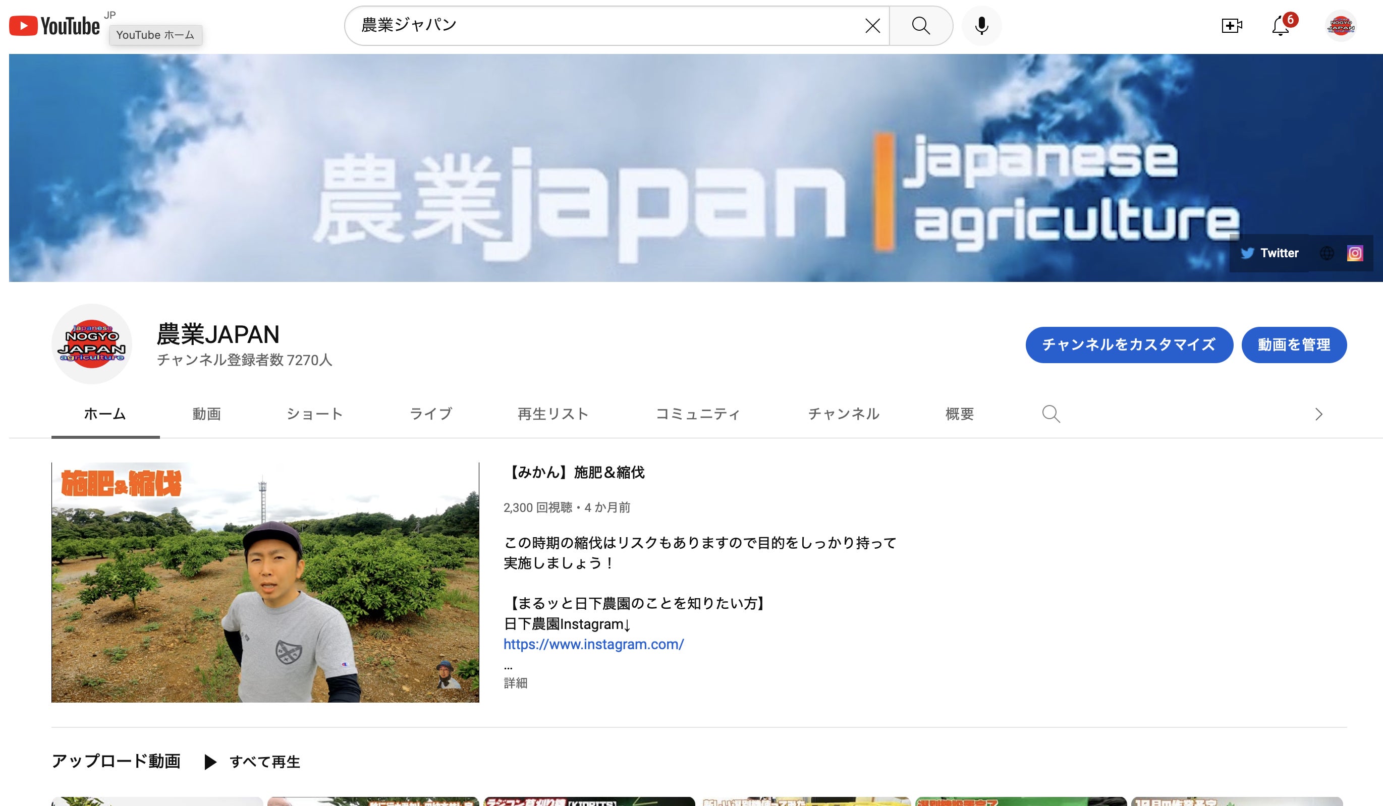 YouTubeチャンネル「農業JAPAN」 登録者数:2022.11現在 7,278人